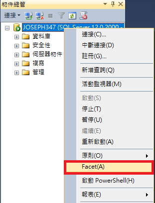 1.在server按右鍵選擇Facet 將XPCmdShellEnable 設為True